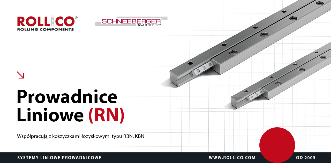 Prowadnice liniowe typu RN mają wymiary zewnętrzne zgodne z prowadnicami liniowymi typu R. Również posiadają profil V, ale jest on w tym przypadku głębszy niż w prowadnicach R. Dzięki temu bieżnia prowadnicy styka się z elementem tocznym na większej powierzchni, co przekłada się na większą nośność łożyska przy zachowaniu tych samych gabarytów. Ponieważ szczelina pomiędzy prowadnicami RN jest mniejsza niż w przypadku prowadnic typu R, są one również odporniejsze na zanieczyszczenia. Prowadnice liniowe typu RN współpracują z koszyczkami łożyskowymi typu RBN oraz KBN.