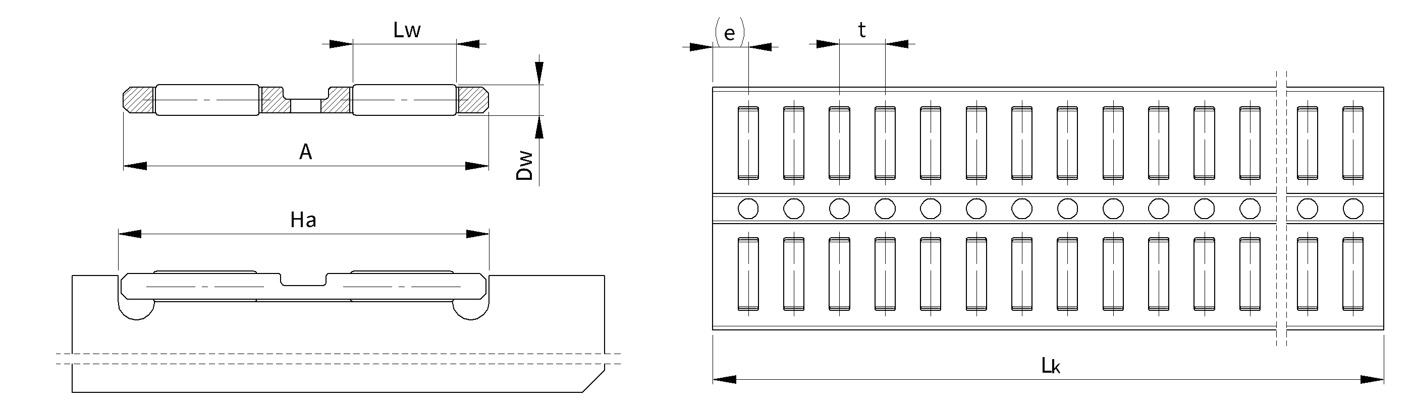 | *) - Nośność dla teoretycznej długości koszyka 100 mm z siłą nacisku „F” zgodnie z rysunkiem. - Nośność odnosi się do prowadnic o twardości 60 +/- 2 HRc oraz gładkości powierzchni Ra<0,4. - Podstawą obliczeń nośności koszyków jest ilość igiełek/wałków/kulek łożyskowych zawartych w koszyku. - Tolerancja długości koszyka LK +0/-t |
