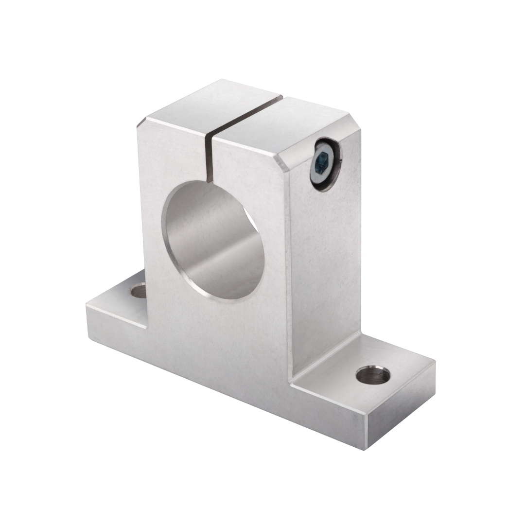 Wykonane z aluminium wsporniki końcowe wałków prowadzących zapewniają stabilne i precyzyjne zamocowanie, stanowiąc balans pomiędzy sztywnością a niską masą, co czyni je odpowiednim wyborem do układów o wysokiej dynamice i ograniczonej masie własnej.