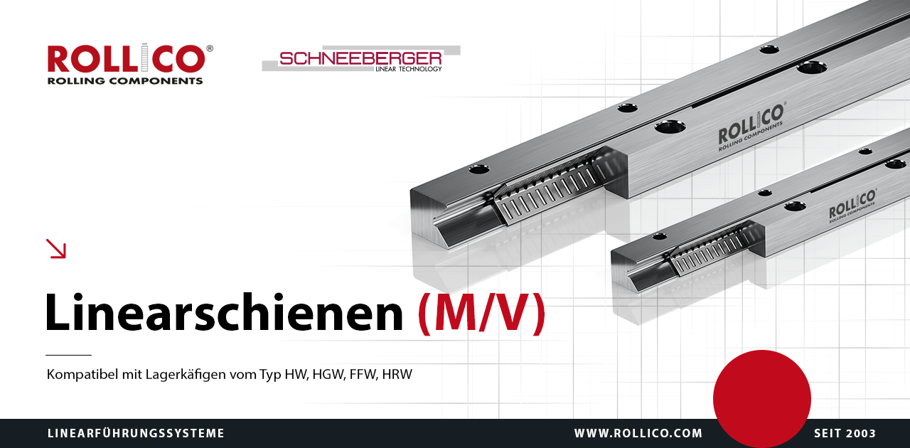 Führungsschienen des Typs M/V sind für den Einsatz unter hoher Belastung konzipiert. Ein auf dieser Schienenart basierendes Lager besteht aus einem Paar M- und V-Schienen mit 90°-Winkel-Laufbahnen. In den Laufbahnen bewegen sich winkelige Nadel-, Rollen- oder Kugellagerkäfige.
