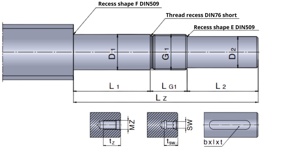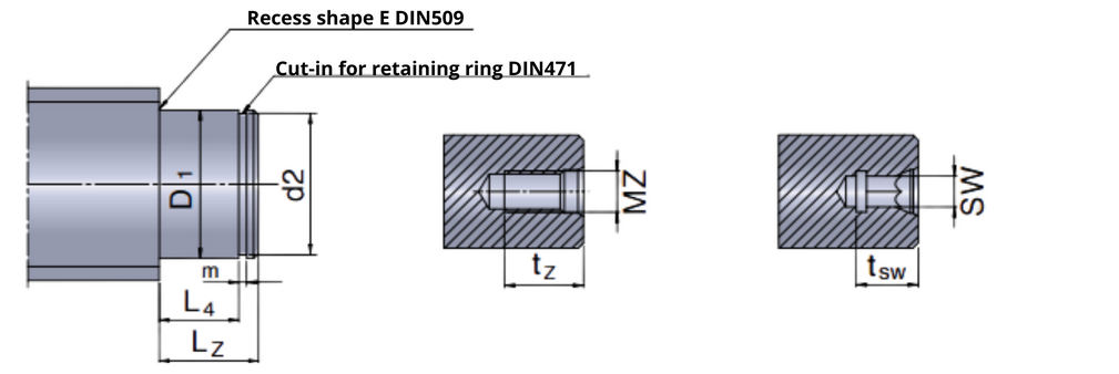 Rys.1 Najprostszym rozwiązaniem jest wykonanie czopu łożyskowego o średnicy nominalnej optymalnej w stosunku do średnicy nominalnej śruby tocznej. W idealnym przypadku powierzchnia odsadzenia pod średnicą rdzenia śruby pociągowej tocznej jest już wystarczająca do przejścia sił łożyska z występującym obciążeniem powierzchniowym.