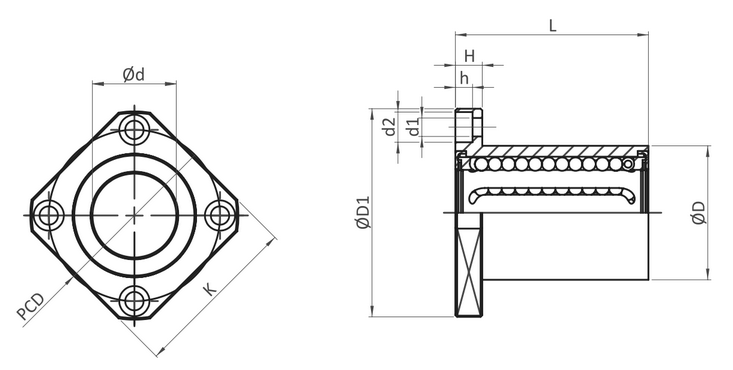 Liniowe tuleje łożyskowe typu LMEK (seria z kwadratowym kołnierzem, wersja standardowa)
